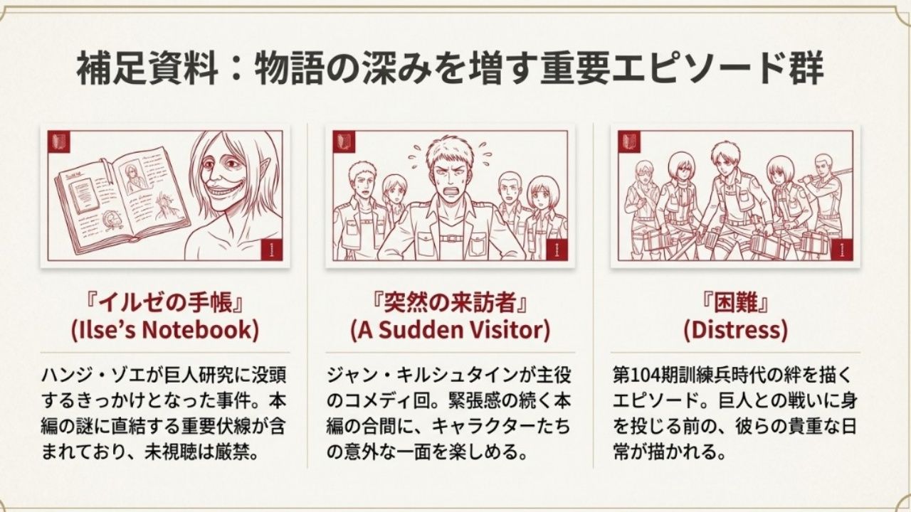 この「失われたピース」を埋めることで、 あなたが知っている進撃の世界はきっとさらに残酷で、 そして愛おしいものに変わるはずです ⚔️✨🕊️
